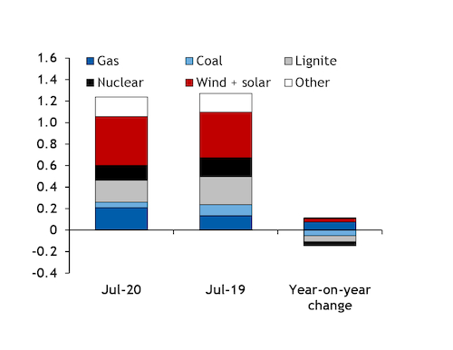 The uptick was driven by a sharp rise in output from Germany's gas-fired plants. These plants produced 209 GWh/d, well up from 134 GWh/d a year earlier, data from research institute Fraunhofer ISE show. This was the highest for any month since the 225 GWh/d in February 2012 and the strongest for any summer month since at least 2011 (see year-on-year power sector gas burn graph).