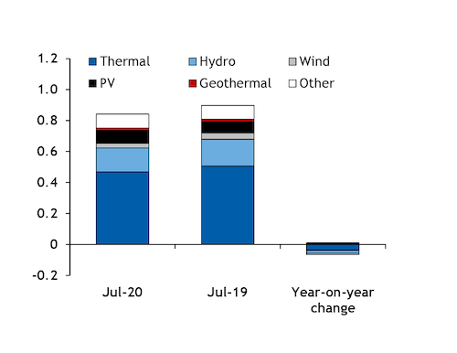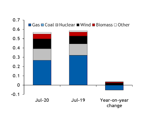 There was little scope for further coal-to-gas switching in the UK, with gas-fired plants having already almost completely displaced coal-fired units in previous years. The country's coal-fired plants did not produce any power at all in July, but output had already been minimal at 797 MWh/d a year earlier.