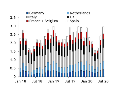 Measures taken to restrain the Covid-19 outbreak and the related economic slowdown sharply cut industrial production earlier this summer. While industrial output has started to rebound as restrictions across the continent have eased, the economic recovery has been gradual. Germany's GDP fell by 10.1pc in the second quarter from January-March. And a recent uptick in Covid-19 cases in Germany and elsewhere in Europe could result in an extension or deepening of remaining restrictions, dampening demand.