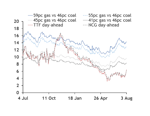 And even the country's oldest, 41pc-efficient gas-fired plants were ahead of the most modern, 46pc-efficient coal-fired units in the merit order. Prompt prices at the Dutch TTF similarly held below the country's lowest fuel-switching prices, with the Netherlands' 45pc-efficient gas-fired plants ahead of 46pc-efficient coal-fired units (see prompt vs fuel-switching gas prices graph).