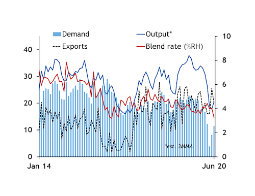 The rate of 3.25pc by volume was the lowest since September 2016 and the second lowest since January 2009, according to strategic reserve Cores. This meant ethanol demand was a little over 10,000t in the month, a decline of 41pc year on year, compared with a drop in gasoline consumption of 23pc on the year to 350,000t (100,000 b/d).