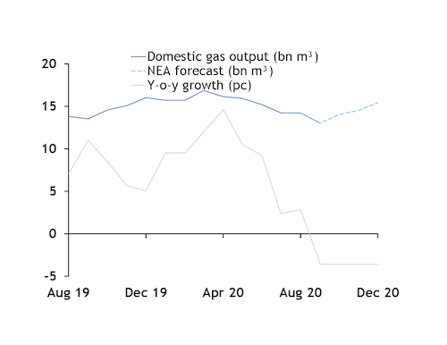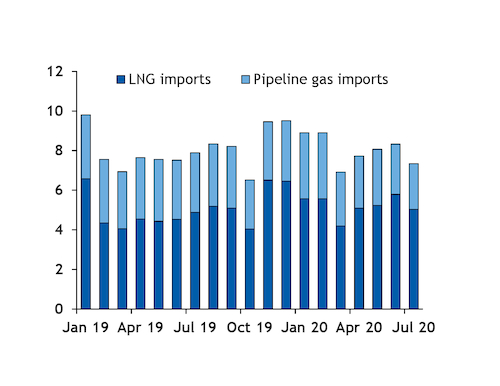 China's National Energy Administration (NEA) issued a report in June forecasting a 4.6pc increase in output this year from 2019, despite production already rising by 11.7pc in January-May. Production growth slowed to 2.4pc in July and 2.8pc in August. But output would have to fall by 3.6pc on average in September-December to reach the NEA's target, which could support LNG demand.