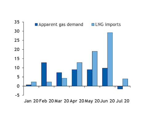 China's LNG demand has held strong so far this year despite the Covid-19 pandemic weighing on the country's gas demand. LNG imports grew by 10.5pc on average year on year in January-July, the latest available official data show, while apparent gas demand grew by 6.8pc over the same period. LNG imports could have also risen significantly in August from a year earlier, with preliminary ship-tracking data suggesting a year-on-year growth of around 20pc. Apparent demand grew by almost 7pc on the year in August.