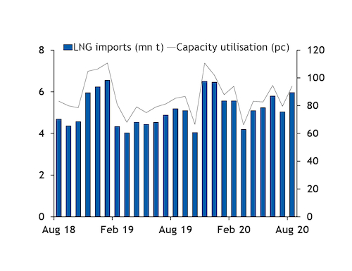 Imports stood at 32.3mn t in October 2019-March 2020, according to the country's customs data, with terminal utilisation rates averaging 88pc. And utilisation held strong this summer, averaging 87pc in April-August, despite typically lower demand in the summer than the winter. It was also up from 80pc over the same period last year, despite the coronavirus outbreak weighing on gas demand.