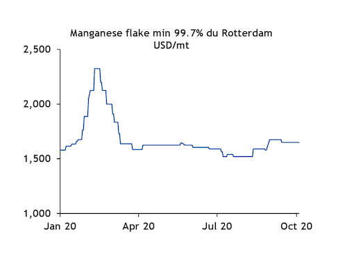 Many traders have welcomed recent price upticks, given the slump manganese prices reached this summer. Argus assessed prices for manganese flake at $1,620-1,680/t du Rotterdam on 6 October, up from the low point this year of $1,480-1,520/t on 21 July. But prices are still lagging behind their year-to-date high of $2,250-2,400/t on 13 February, after lockdowns in China — the world's biggest producer of flake — caused the European market to spike.