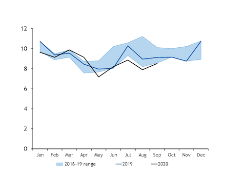 But Japanese LNG imports rose by 1pc on the year in September and were more robust than coal receipts in the third quarter, with import costs softening significantly as oil-linked prices continued to fall. Thermal coal imports fell by 11pc on the year in July-September, while LNG arrivals were down by only 4pc. This contrasted with the first half of 2020, when coal and LNG receipts fell by 2pc and 5pc, respectively.