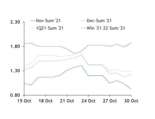The firm may be able to rely on existing booked capacity and storage withdrawals to meet customer nominations over the rest of winter. This will partly depend on how restrictions aiming to limit the spread of Covid-19 recently imposed by European governments influence consumption. Further restrictions were included as a relevant factor for the firm's sales by Gazpromexport general director Elena Burmistrova late last month.