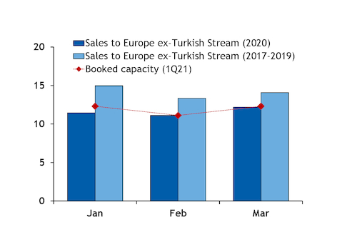 Gazprom could maintain first-quarter sales to Europe, excluding the Baltic states and countries served by Turkish Stream, flat with a year earlier without booking more transport capacity or withdrawing from storage, assuming Yamal-Europe and Nord Stream flows in line with maximum capacity (see sales scenario graph).