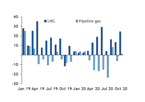China's LNG imports rose to 5.02mn t last month from 4.04mn t a year earlier, data from China's General Administration of Customs (GAC) show. Year-on-year growth of 25.4pc was 2020's second-strongest after June, when imports jumped by 29.2pc to 5.79mn t.