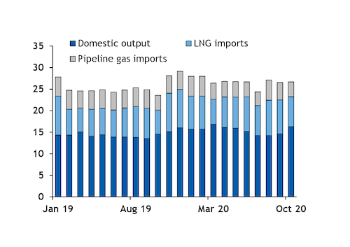 Chinese LNG demand was stronger on the year despite the 1-8 October Golden Week holiday, which typically sees slower industrial activity and reduced industrial gas demand. But industrial output rose by 6.9pc on the year last month, up from a rise of 4.7pc in October 2019, data from the national bureau of statistics show. Industrial output grew by only 1.2pc in January-September, checked by sharp falls in January and February.