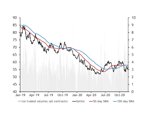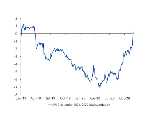 After shedding $5.35/t in the two weeks to 6 November ahead of new lockdown measures in Europe, the API 2 year-ahead has since gained $4.35/t to settle at $58.50/t on 24 November and was trading higher again as of 13:00 GMT on 25 November.
