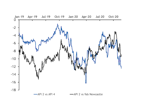 The increase in API 2 year-ahead prices has therefore been far outpaced by the equivalent API 4 and fob Newcastle contracts, which held premiums of $12.45/t and $8.91/t, respectively, to the API 2 calendar 2021 yesterday, from $9.75/t and $7.61/t on 30 October.