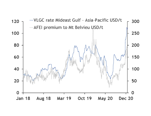 The sharp rate increase recorded in the fourth quarter stalled from 11 December and some lifters in the US re-sold cargoes rather than pay higher freight rates, suggesting a ceiling has been reached. But the spread on the forward curve between AFEI and US propane swaps suggests the arbitrage could endure through winter. It is likely to begin to narrow through spring returning to levels comparable with early November, before the spike began.