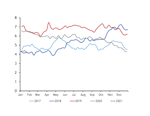 Port stocks in the ARA region are already down by 2.3mn t on the year having been drawn 1.5mn t lower since October, and the incentive to restock is much weaker than last year as strength in spot prices has flattened the contango on the forward curve compared with early 2020. Physical spot prices are currently $3/t lower than the front fourth-quarter API 2 swap, compared with nearly $9/t this time last year.