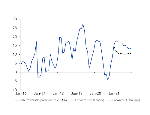 Argus' NAR 6,000 kcal/kg fob Newcastle assessment on 15 January held a $17.85/t premium to the cif ARA market. This was up from $12.43/t in late December and $6.49/t during November, as an unseasonably cold winter in northeast Asia has rattled energy markets.