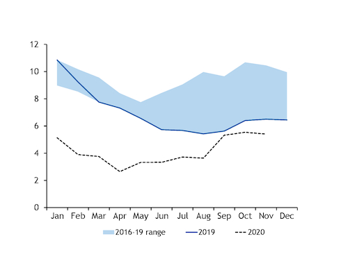 The API 2 second-quarter 2021 swap currently holds a $2.35/t discount to the fourth quarter, down from more than $6/t on the equivalent pair last year. And the fourth-quarter API 2 coal swap is $13.35/t lower than equivalent derivatives for high-CV fob Newcastle coal traded through the Ice platform, which is out from a $5.70/t discount in early October, creating a strong incentive for Atlantic suppliers to divert flexible supply into the Pacific early next winter.