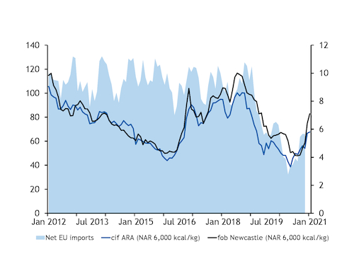 Rallying European coal prices and a brief convergence with Asia-Pacific markets in late 2020 has supported a modest recovery in EU imports this winter, but widening premiums in Asia should keep seaborne arrivals in Europe under pressure again this year.