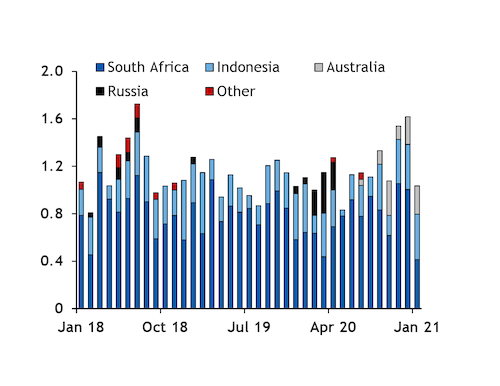 Arrivals from South Africa should pick up now that the maintenance has ended, while suppliers in Indonesia have faced their own logistical problems owing to heavy rainfall.