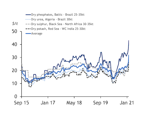 Argus' selected basket of fertilizer freight rates, including urea from Algeria to Brazil, Russian MAP to Brazil, potash from the Red Sea to India, and sulphur from the Black Sea to north Africa, jumped by an average of $5.50/t on last week. The average rate hit $31.83/t, marking the highest level since the basket has been collectively assessed from mid-September 2015. The average rate is up by almost $10/t — a jump of 45pc — since the start of December.