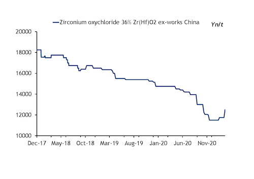 Argus assessed prices for 36pc grade zirconium oxychloride at 12,000-13,000 yuan/t ($1,856-2,010/t) on an ex-works China basis on 23 February, up from the previous assessment of Yn11,500-12,000/t. This is the first time the price has risen since October 2018, when it was trading at Yn16,500-17,000/t.