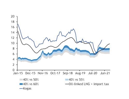 Based on recent prices, the 38pc coal-switching price for a 55pc efficient gas-fired plant is around $7.60/mn Btu, which is significantly lower than Kogas' latest tariff. This could help coal to displace gas in the mix from next month, when winter plant restrictions ease.