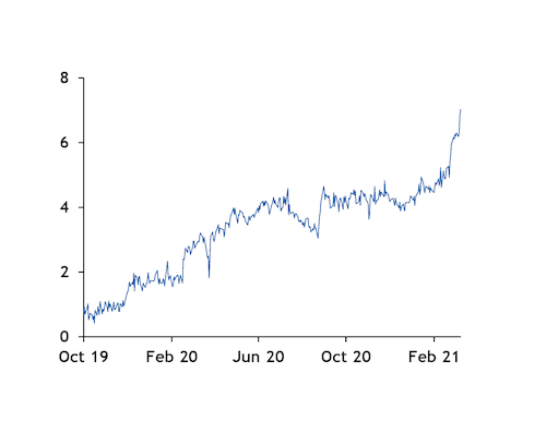 So far this winter working day-ahead clean spark spreads have averaged £11.14/MWh, up from £3.42/MWh in the previous winter. This has been driven by price spikes, particularly in January, owing to low conventional plant availability and low wind output. And it has been higher than expected — the front winter clean spark spread was £8/MWh at the end of September 2020.