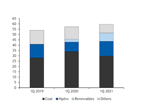 Vietnam's increased renewables and hydro output meant that demand for coal reduced despite overall power generation increasing. The country's first-quarter power generation increased by 4pc on the year to 59.7TWh, up from 57.3TWh in 2020 and 53.9TWh in 2019.