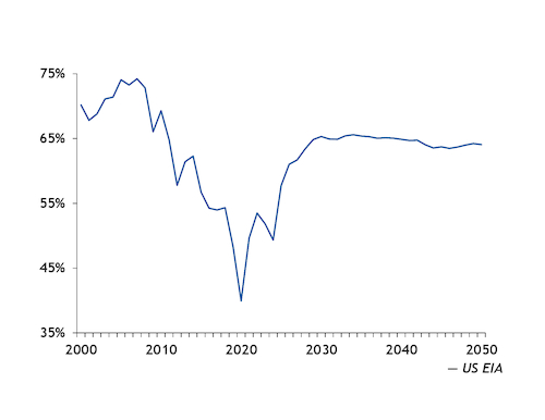As the older, less efficient units retire, the remaining units can expect to run up to 65pc of the time by the end of this decade, EIA data show. That would be the realistic maximum capacity factor for coal units now, Martin said, meaning that coal-fired power plants at the end of this decade could be maximizing their output. And they are expected to maintain that level through at least 2050.