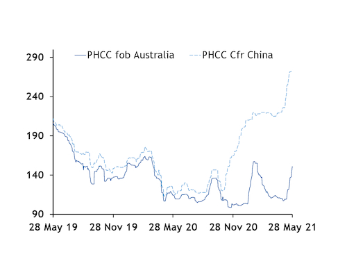 The Argus assessment for premium hard coking coal on a cfr China basis rose by 86.1pc from $146.50/t cfr in early October, as Chinese buyers switched to Canadian and US coal with limited options following the import curb. The cfr-fob spread for tier-one premium low-volatile hard coking coal widened to a record $143.30/t on 18 May from $10.50/t on 1 October 2020. The gap has narrowed to $123.15/t today after a 40.8pc rise in fob prices month-to-date ahead of expected tighter supplies.