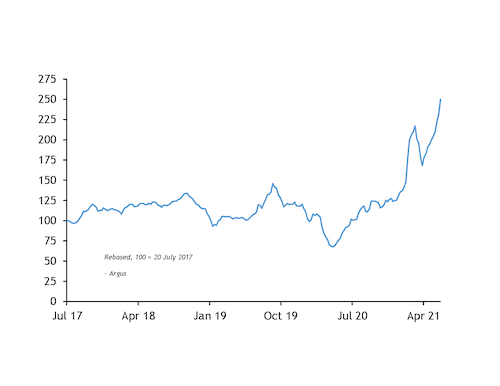An average basket of 19 selected fertilizer freight rates, spread across major shipping routes for urea, phosphates, NPKs, potash and sulphur, jumped to $48.34/t, Argus calculates. This new high marks a $3.50/t rise on levels last week.