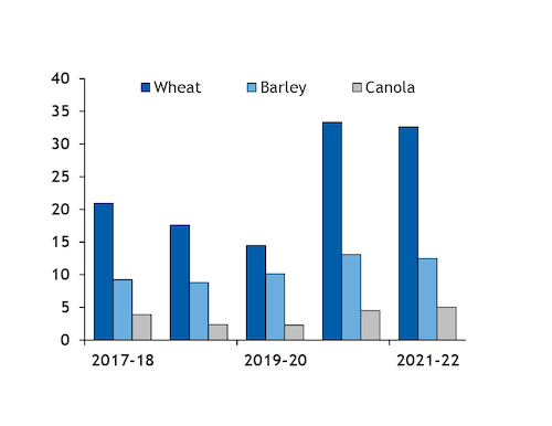 Australia is forecast to harvest around 32.6mn t of wheat in the 2021-22 marketing season ending 30 September, just 2pc below a record 33.3mn t produced the 2020-21 season, according to the latest estimates from the Australian Bureau of Agricultural and Resource Economics and Sciences (Abares).