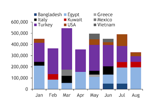 In August, an estimated 50,000t was shipped to Turkey, the lowest monthly total since May 2020, when all UK exports were frozen for most of the month because of disruption caused by the first wave of Covid-19.