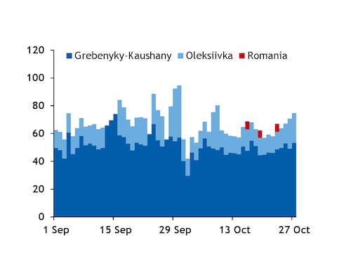 Some 5.59 GWh/d was sent to Moldova from Romania at the recently expanded Iasi-Ungheni border point on three separate days this month. But there were no deliveries on any other days in October, with the most recent deliveries on 23 October. And none was sent along the Trans-Balkan Pipeline (TBP) from Romania.