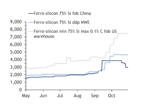 Tight supply and a lack of imports is keeping ferro-silicon prices at record highs in Europe, despite Asian prices falling amid loosening energy restrictions in key production regions in China.