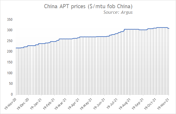 Export prices for APT were assessed at $306-311/mtu on 18 November, down by $4/mtu from a week earlier, which is slower than the fall in domestic prices, as key exporters were unwilling to cut offers considering continued delayed shipping periods, tight spot availability outside of China and firm prices in the European and US markets. Argus assessed prices for APT stable at $320-325/mtu in Rotterdam from 21 October to today.
