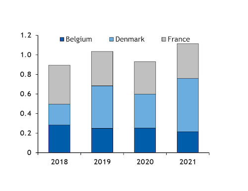 Danish biomass-fired generation is also likely to remain strong in 2022, given the strong forward power prices, after reaching a record high this year. Danish state-controlled utility Orsted significantly increased the share of its heat and power generation from biomass this year, bolstered by higher power prices and a cost advantage over coal. The power prices rose sufficiently to even allow the utility to sell a part of its output to the free market, without receiving any state-backed support.