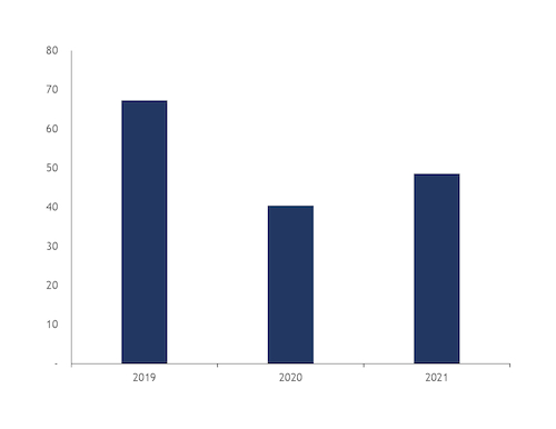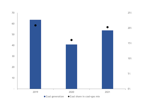 Total coal-fired generation across Germany, Spain, the UK and France in the first 11 months of 2021 rose by 37pc year on year to 53.76TWh but was still 15pc lower than over the same period two years ago. The significant increase in European coal-fired generation margins throughout 2021 supported strong utilisation of coal power plants.
