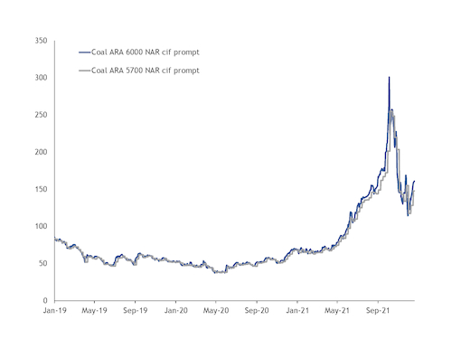 As a result, coal stocks at the Amsterdam-Rotterdam-Antwerp (ARA) transshipment hub, a key indicator for the European coal balance, have trended down since October 2020 and remained at a historically seasonal low level throughout 2021.