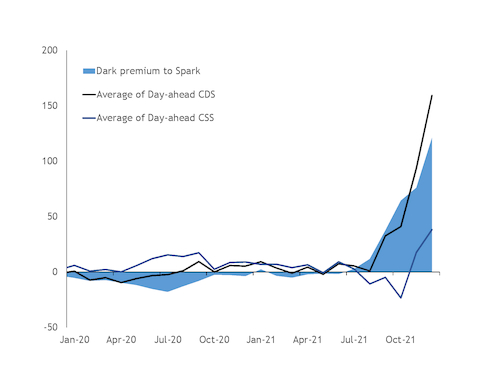 And a shortage of natural gas has exacerbated the need for coal-fired generation. A shortfall in European gas storage levels, intermittent pipeline imports and stiff competition from Asia for LNG propelled European gas prices to new highs in 2021 and well beyond fuel-switching thresholds. At current forward prices, coal-fired generation is more profitable than gas for generation in Germany through to 2024.