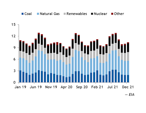 But power plant retirements and the continued buildout of renewable generating capacity also have weighed on coal. While total generation in the contiguous US fell to an average 10.4mn MWh/d from 1-27 December from 10.7mn MWh/d in December 2020, it still was 0.8pc higher than in December 2019.