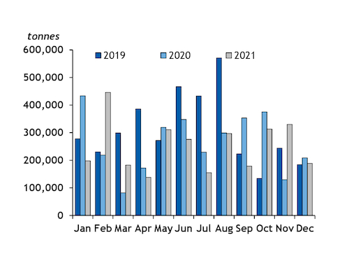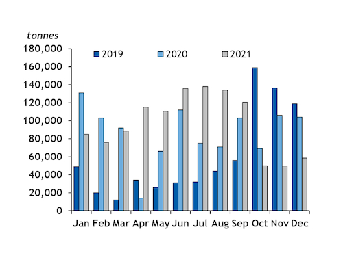 Non-oxy barge volumes rebounded to 58,600t in December, from a 19-month low of 49,700t in November. This compares with 104,000t a year in December 2020.