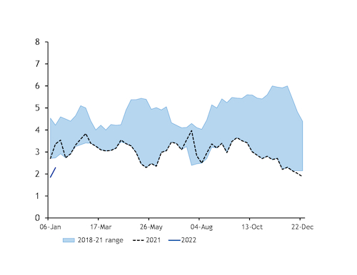 The discount for Richards Bay NAR 4,800 kcal/kg coal to API 4 has also tightened significantly, closing at $19.25/t on 7 January. The last time the spread was tighter than this was in November 2020. This week, a 50,000t March cargo of this grade traded at a $17/t discount to API 4.