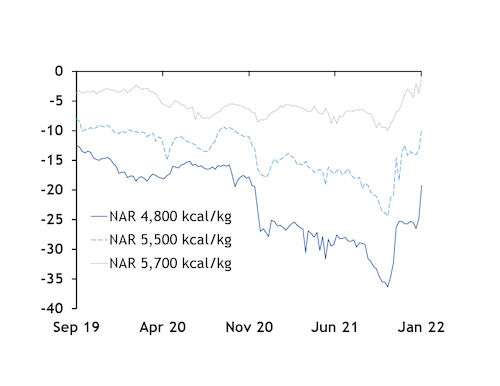 The Richards Bay NAR 5,700 kcal/kg differential, meanwhile, is now close to parity with API 4, assessed at a discount of just $1/t on 7 January, the smallest spread between the two products since at least September 2019.