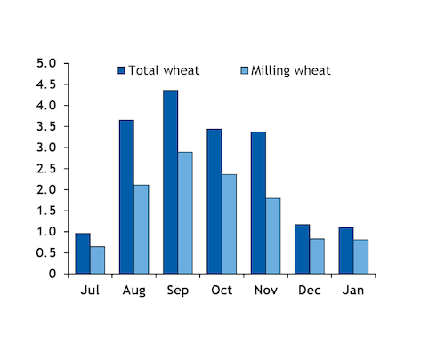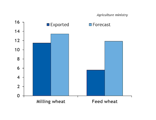 Ukrainian companies have already shipped about 11.5mn t of milling wheat since the start of the marketing year in July (see chart). This leaves only 2mn t of product available for exports for the remainder of the season without threatening national food security, with the full volume expected to be shipped over the next two months, according to Ukraine's agriculture ministry.