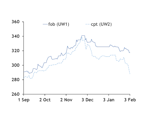 The Argus-assessed Ukraine spot fob wheat price for 11.5pc protein grade (UW1) has dropped by $12/t on the week to close 2 February at $311/t — its lowest since 20 October last year. Meanwhile, Ukraine's spot cpt price for product (UW2) has fallen by $15/t week on week to close today at $288/t — its lowest since mid-September last year (see chart).