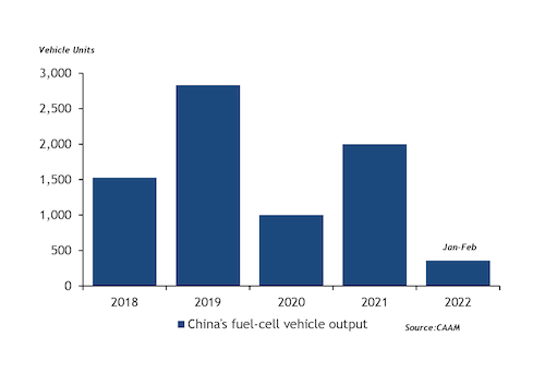 China produced 356 fuel-cell vehicles during January-February this year, up by 500pc from a year earlier, according to China Association of Automobile Manufacturers (CAAM) data. It produced 2,000 fuel-cell vehicles in 2021, up by 48.7pc from the previous year. The country is expected to sell 5mn units of new energy vehicles this year, up by 42pc from 3.52mn units in 2021, CAAM said.