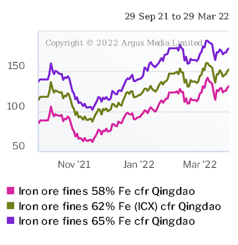 Argus last assessed the 65pc Fe iron ore price at $178.80/dmt cfr Qingdao on 28 March, up from $140.20/dmt on 1 January and $95.95/dmt five years ago.