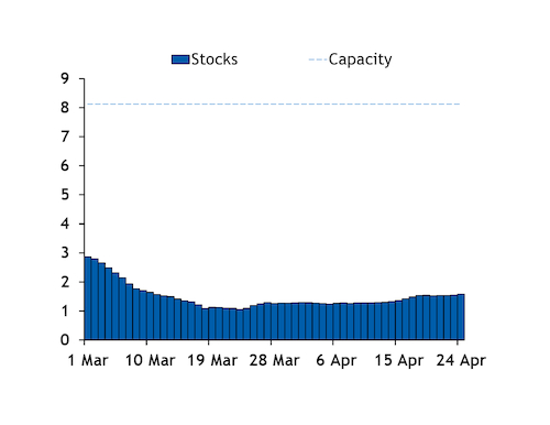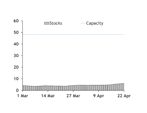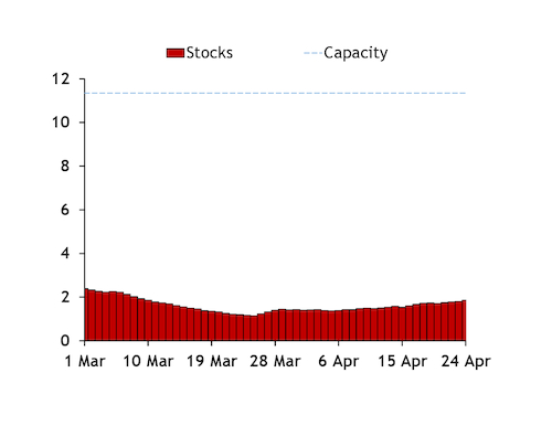 Gazpromexport holds 1.85bn m³ of space at Bergermeer in the Netherlands under a long-term agreement, having provided the site's cushion gas. Bergermeer stocks were 6.3TWh on the morning of 28 April, about 13pc of capacity (see Bergermeer graph). Gazprom "made no use" of this space last summer, the Dutch economy ministry has previously said.