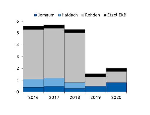 Gazprom's ex-subsidiary, Wingas, has long been the owner of the Rehden site and was co-investor in all but 100mn m³ of Jemgum's 900mn m³ capacity. Jemgum held 1.52TWh this morning, following net injections this month (see Jemgum graph).