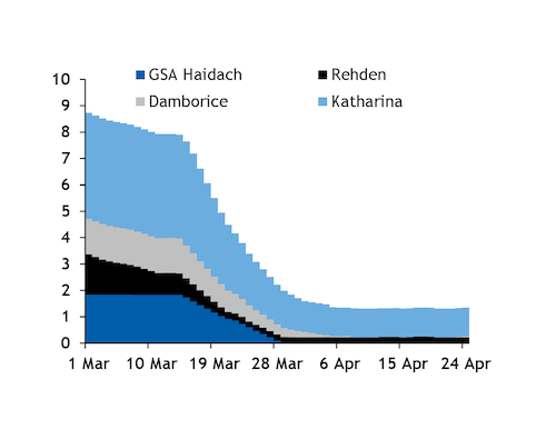 There was a move starting in mid-March to strong withdrawals from relative inactivity at three sites at which Gazpromexport holds most of the capacity — its share of Haidach in Austria, at Damborice in the Czech Republic, and at Katharina in Germany. And withdrawals at the 44TWh Rehden facility, Germany's largest site, accelerated at the same time as the other three sites (see Gazpromexport recent stocks graph).